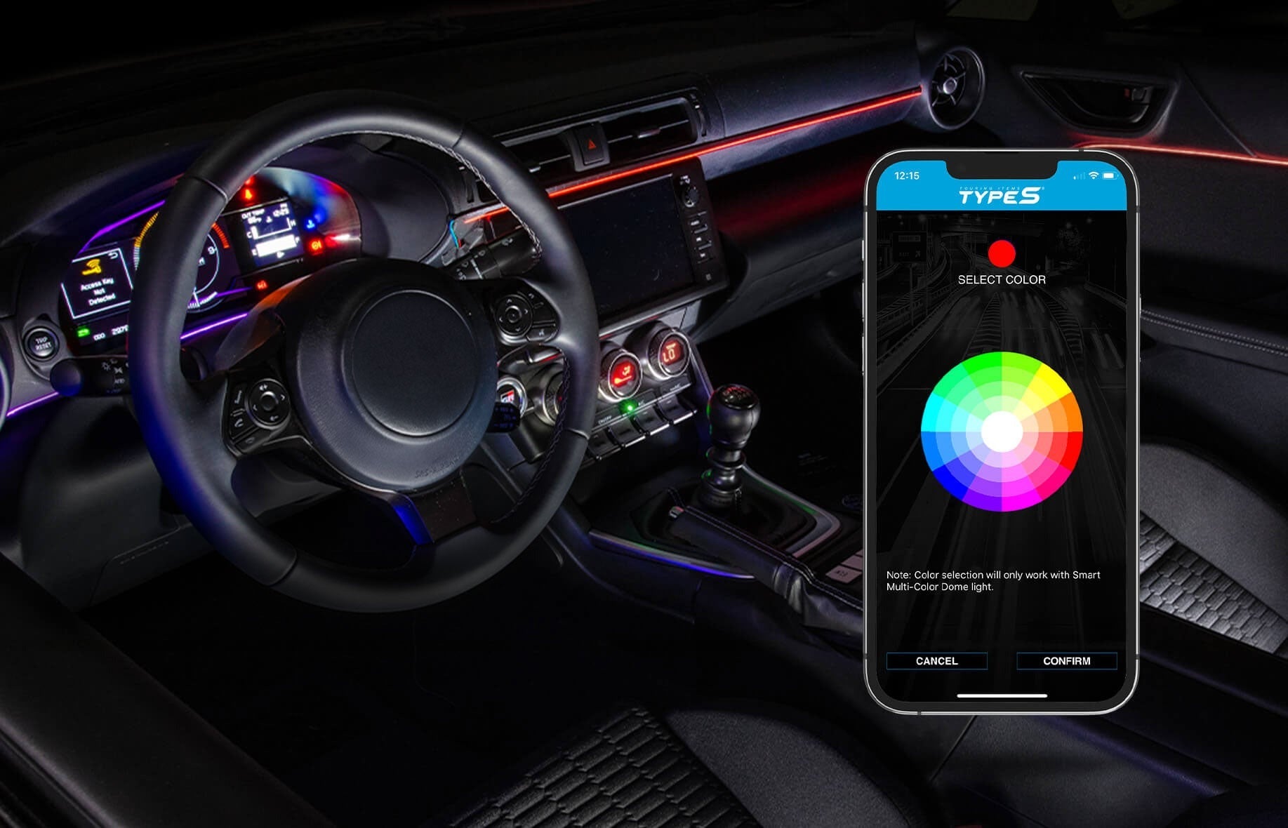 Easily control your lighting experience wirelessly with the TYPE S LED app, featuring 49 unique colors, 8 light modes, and dual-zone control for the ultimate interior lighting experience.