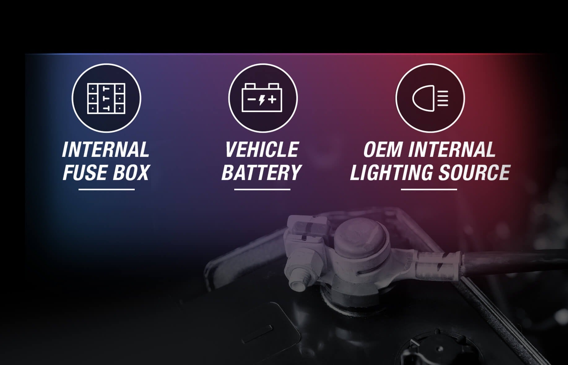 This Pro Series LED Kit requires a 12V power source through the internal fuse box, vehicle battery, or through splicing with an OEM internal lighting source. Fuse adapter not included.