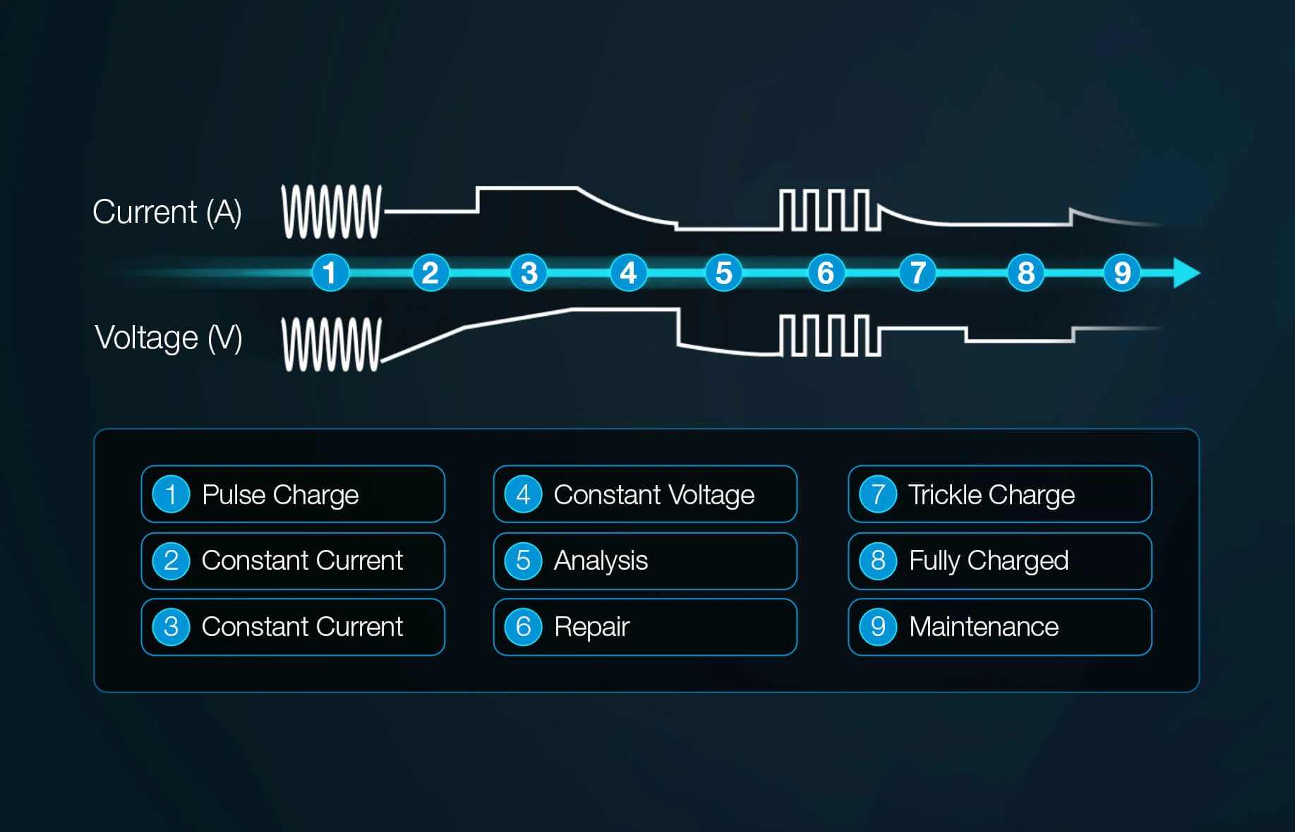 The embedded smart microprocessor performs battery charging and maintenance in 9 intelligent charging stages.