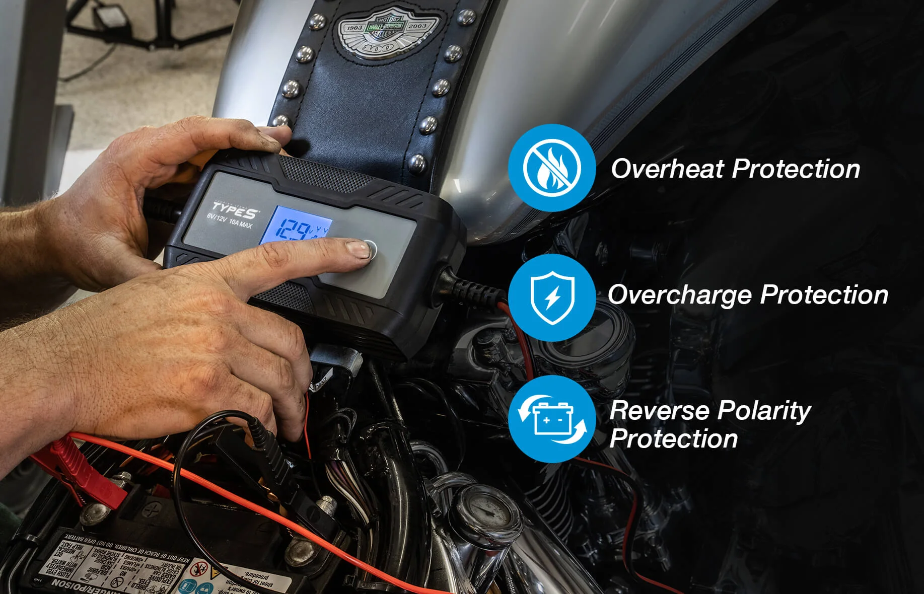 Designed with reverse polarity protection, overheat protection & spark-proof clamps.
