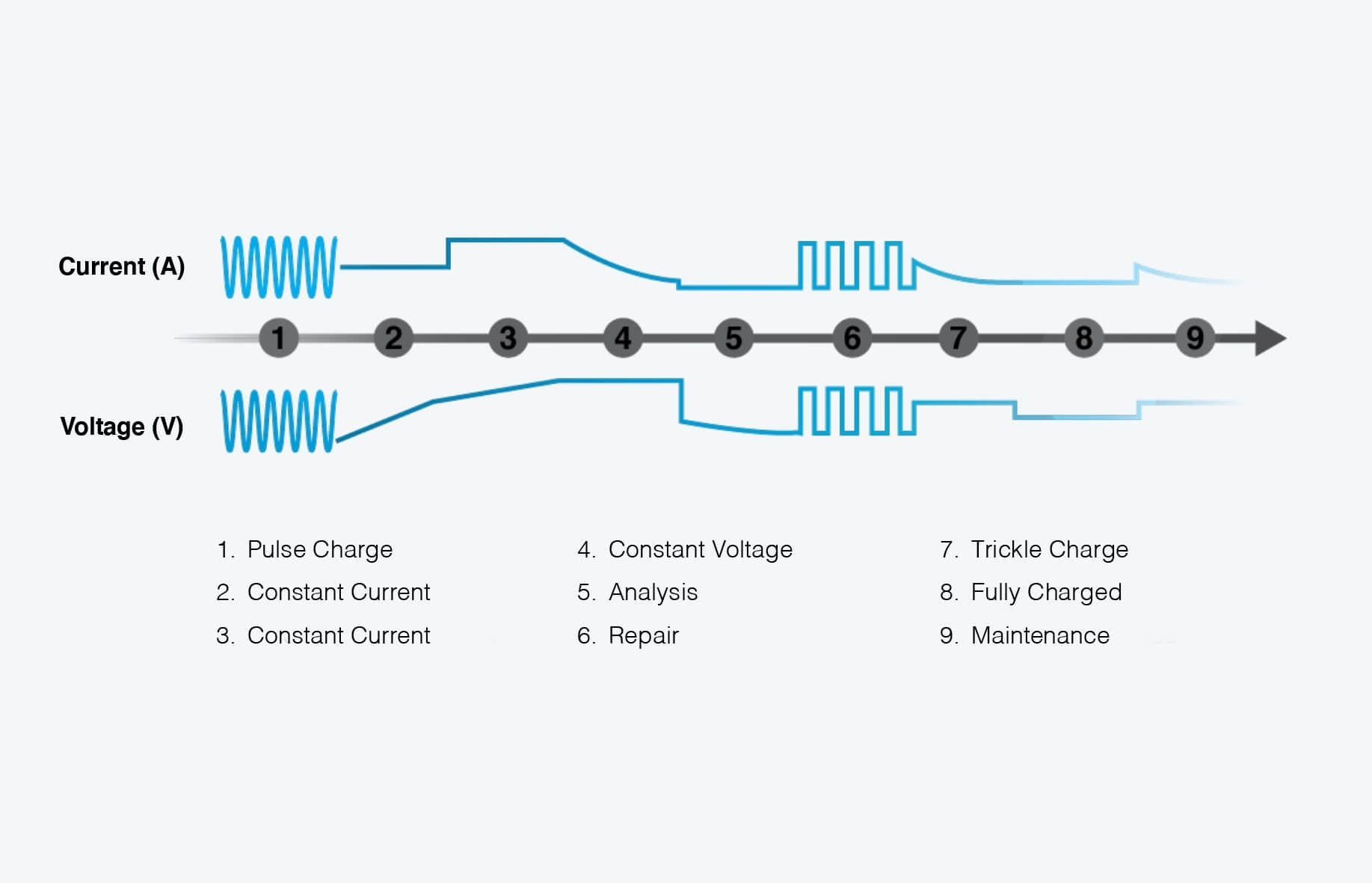 The embedded smart microprocessor performs battery charging and maintenance in 9 intelligent charging stages.