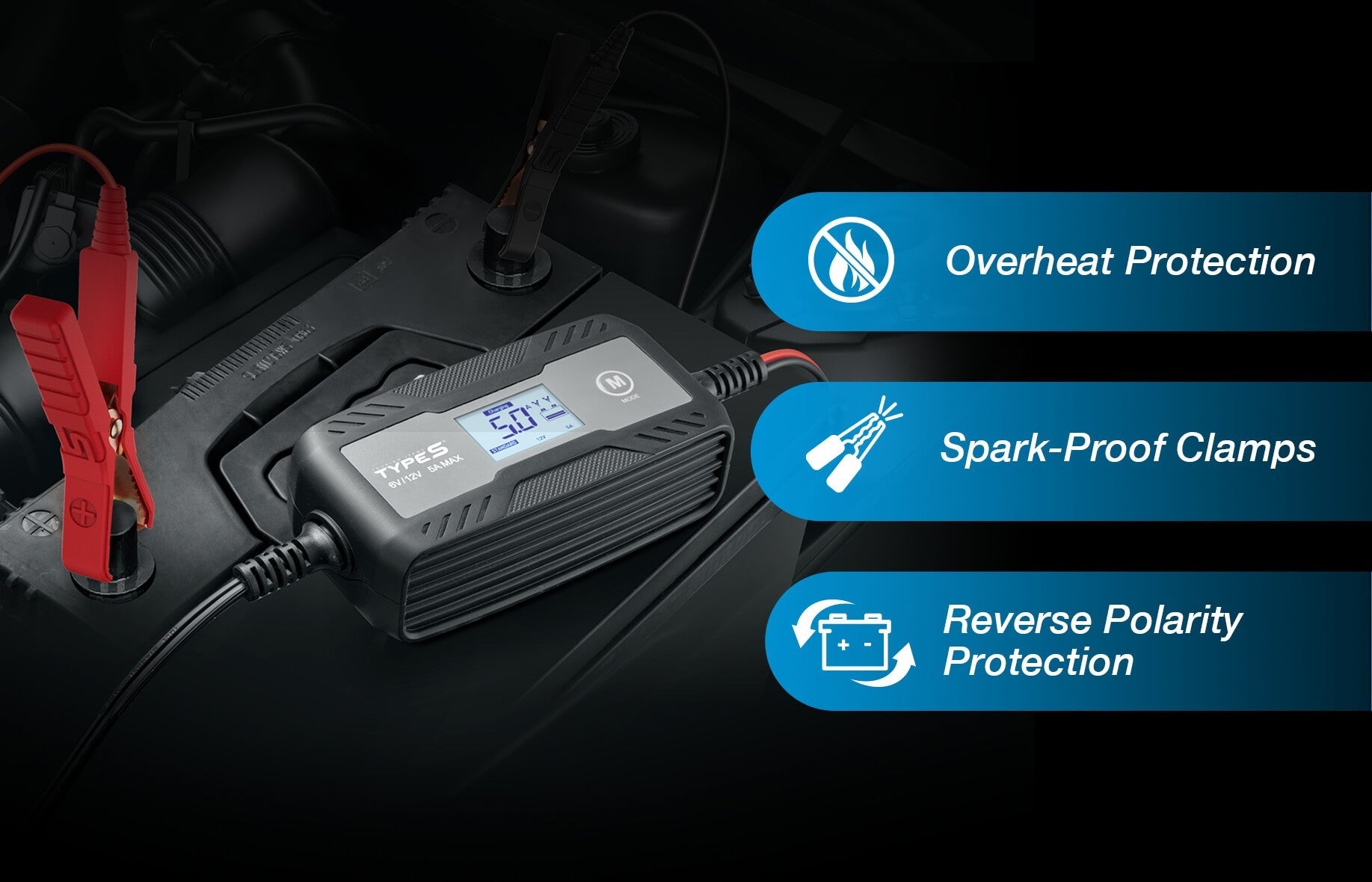 The TYPE S 5A Battery Charger and Maintainer will keep your stored vehicle's battery charged and maintained. Charge standard lead-acid, GEL, AGM, and lithium-ion (LiFePO4) batteries at 6V or 12V. Easily keep vehicles such as classic cars, trucks, motorcycles, RVs, UTVs, and more charged year-round. Advanced battery recovery mode efficiently repairs and restores impaired battery cells. Battery charger includes SAE connectors.