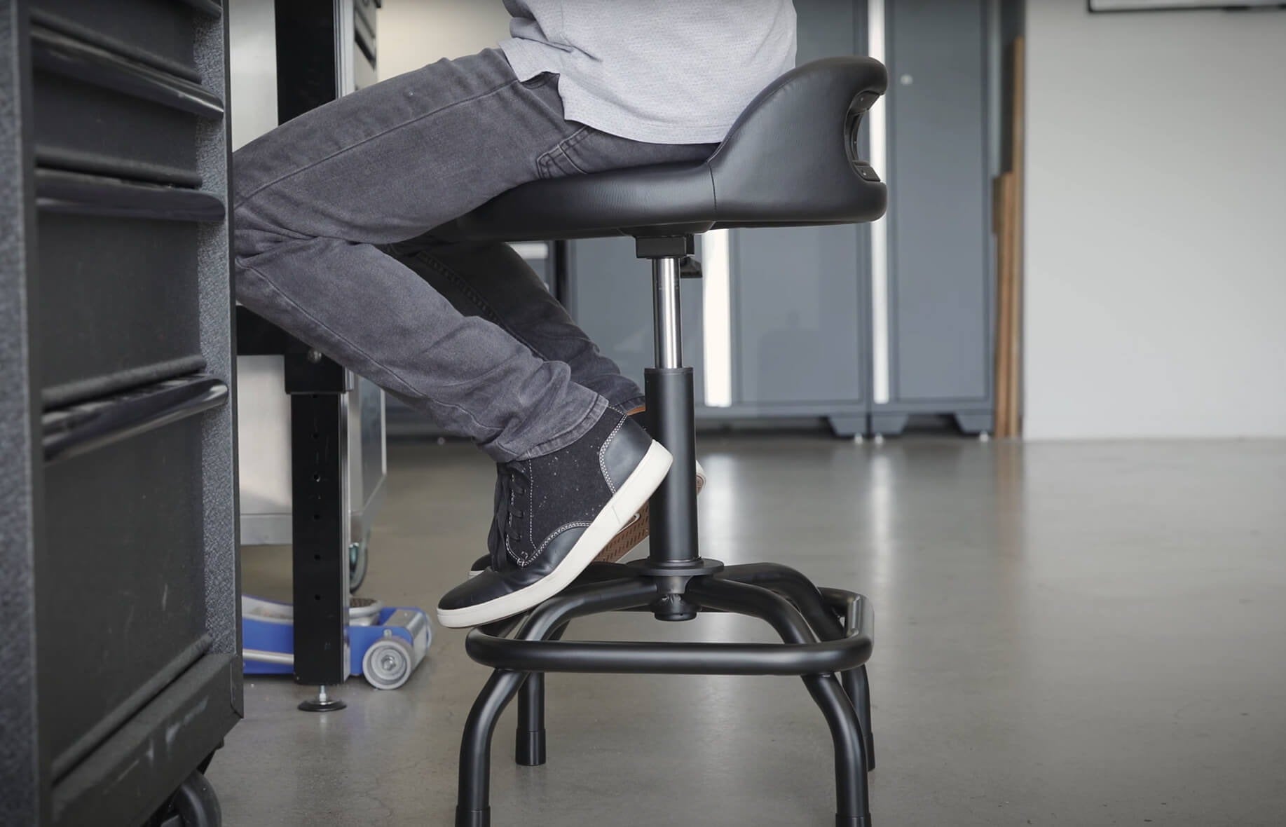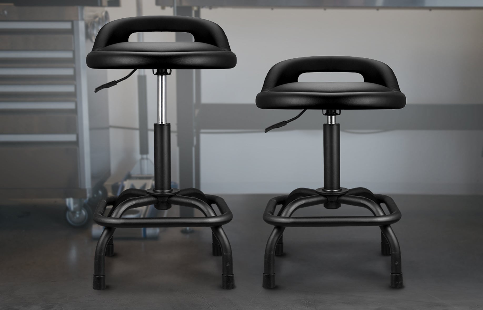 The TYPE S Ultra Cushioned Shop Stool is a blend of comfort and style ideal for the workspace, garage, or home. Durable, synthetic leather wraps around the deluxe foam seat. Designed with an adjustable seat, hip support and convenient, reinforced handle, this stool is the definition of functional style.